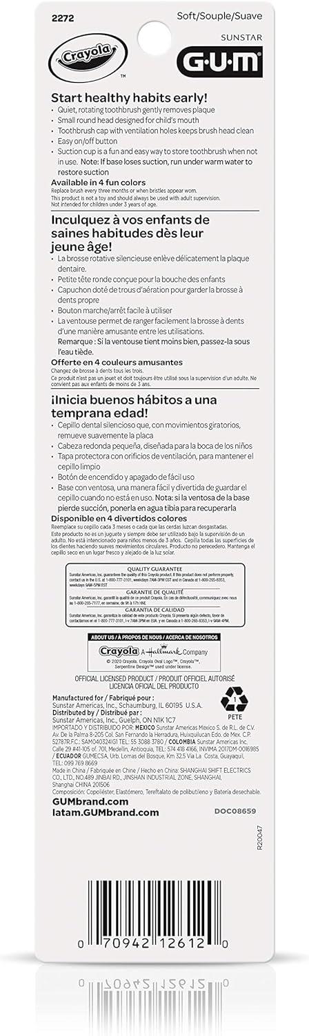 GUM Crayola Power Toothbrush for Kids, Extra Soft Bristled Toddler Toothbrushes, Travel Cap + Suction Cup Base, Batteries Included, 1 Count(1 Count)